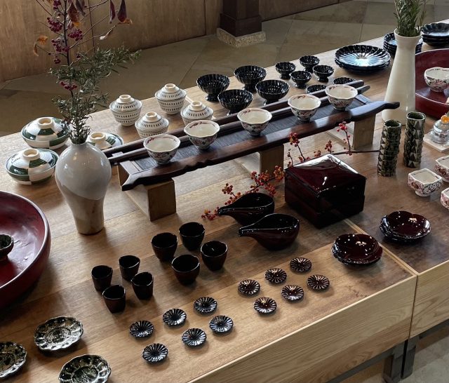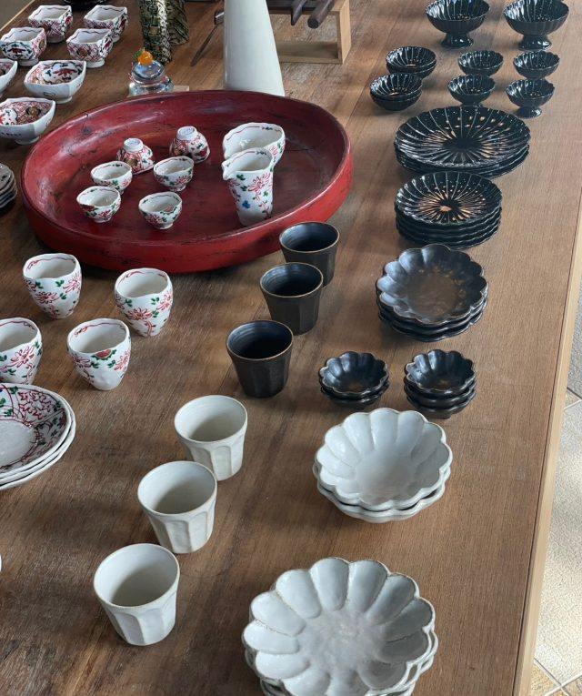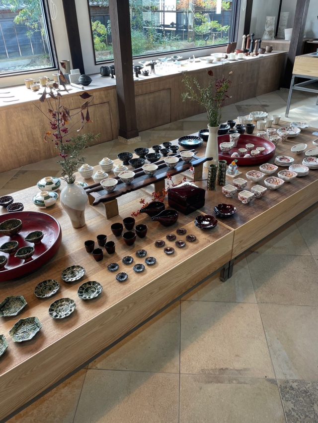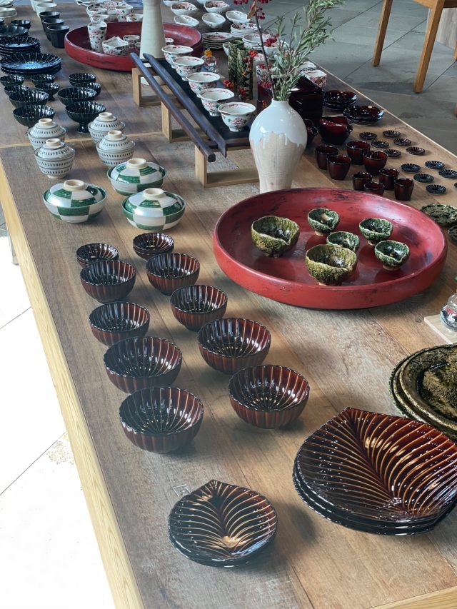 リンカ、ぎやまん陶、漆ブラウンの重箱、酒器等展示販売しております。