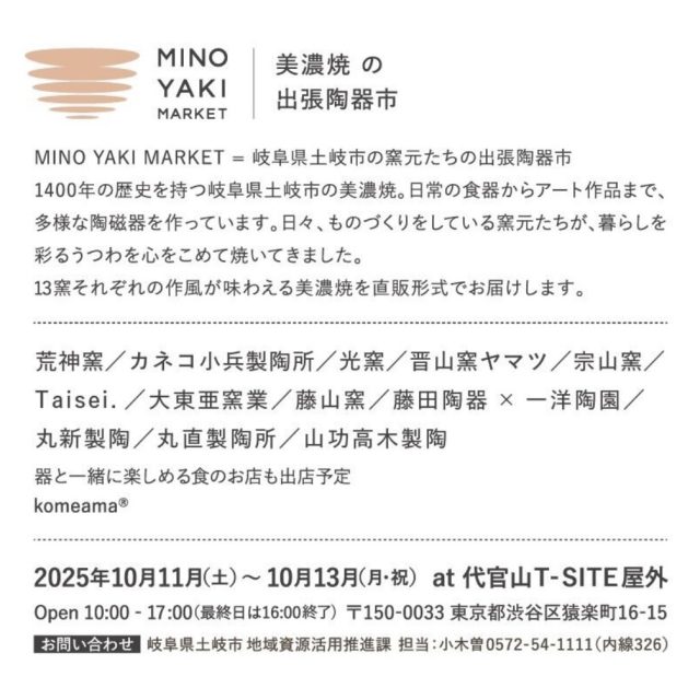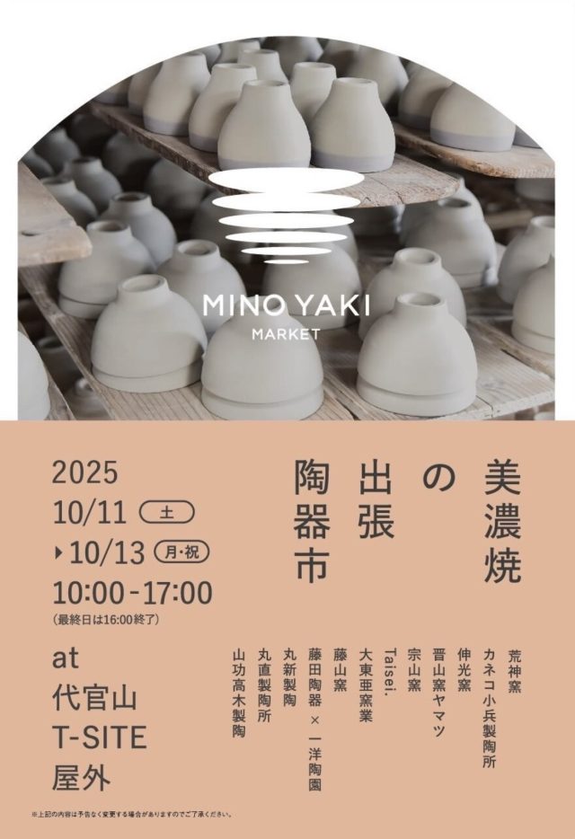 10/11(土)〜13(月) 代官山T-SITEでのMINOYAKI MARKET 出張陶器市に出店します